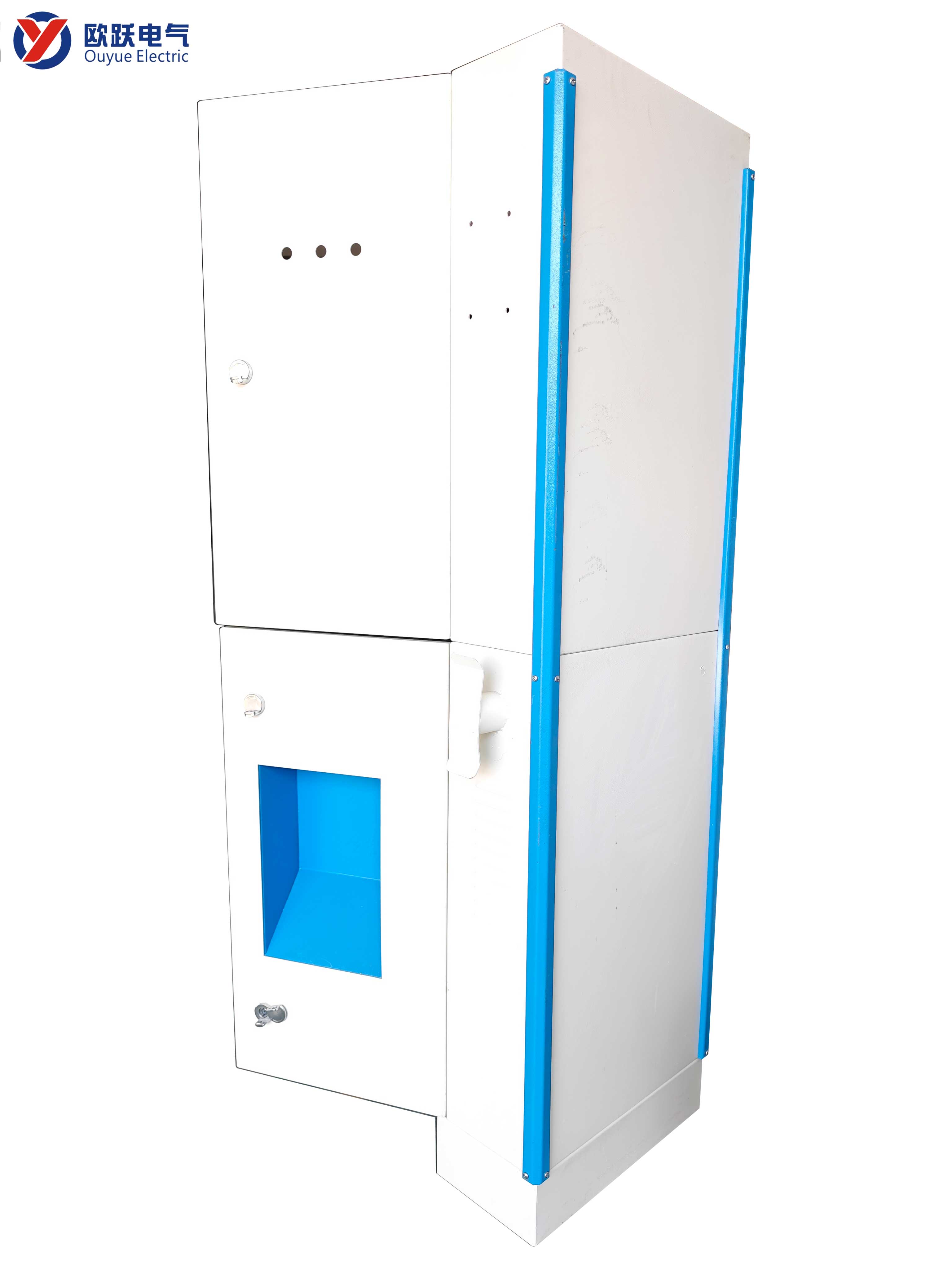 Ta model je prilagojena škatla za števec električne energije iz pocinkane jeklene plošče, posebej zasnovana za nove polnilne kroge. Ima dvoslojno strukturo z zgornjimi in spodnjimi priključki, kar zagotavlja dovolj prostora za ožičenje in omogoča tesno namestitev električne opreme v omarico števca električne energije. Ohišje škatle je izdelano iz visoko trdne pocinkane jeklene pločevine, ki ima odlične protikorozijske lastnosti in dolgo življenjsko dobo. Izdelek ima modro-belo barvno shemo po meri, opremljen z vgrajenimi ročaji ter odprtinami za prezračevanje in odvajanje toplote na obeh straneh, kar ne zagotavlja samo prenosnega delovanja, ampak ima tudi odlično zmogljivost odvajanja toplote. Splošna raven zaščite izdelka je visoka, kar lahko izpolni zahteve za dolgoročno stabilno delovanje zunanjih polnilnih pilotov.